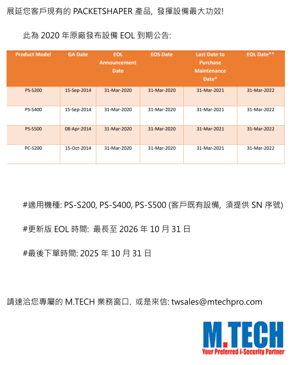 BROADCOM 重大訊息通知 – PACKETSHAPER產品週期更新